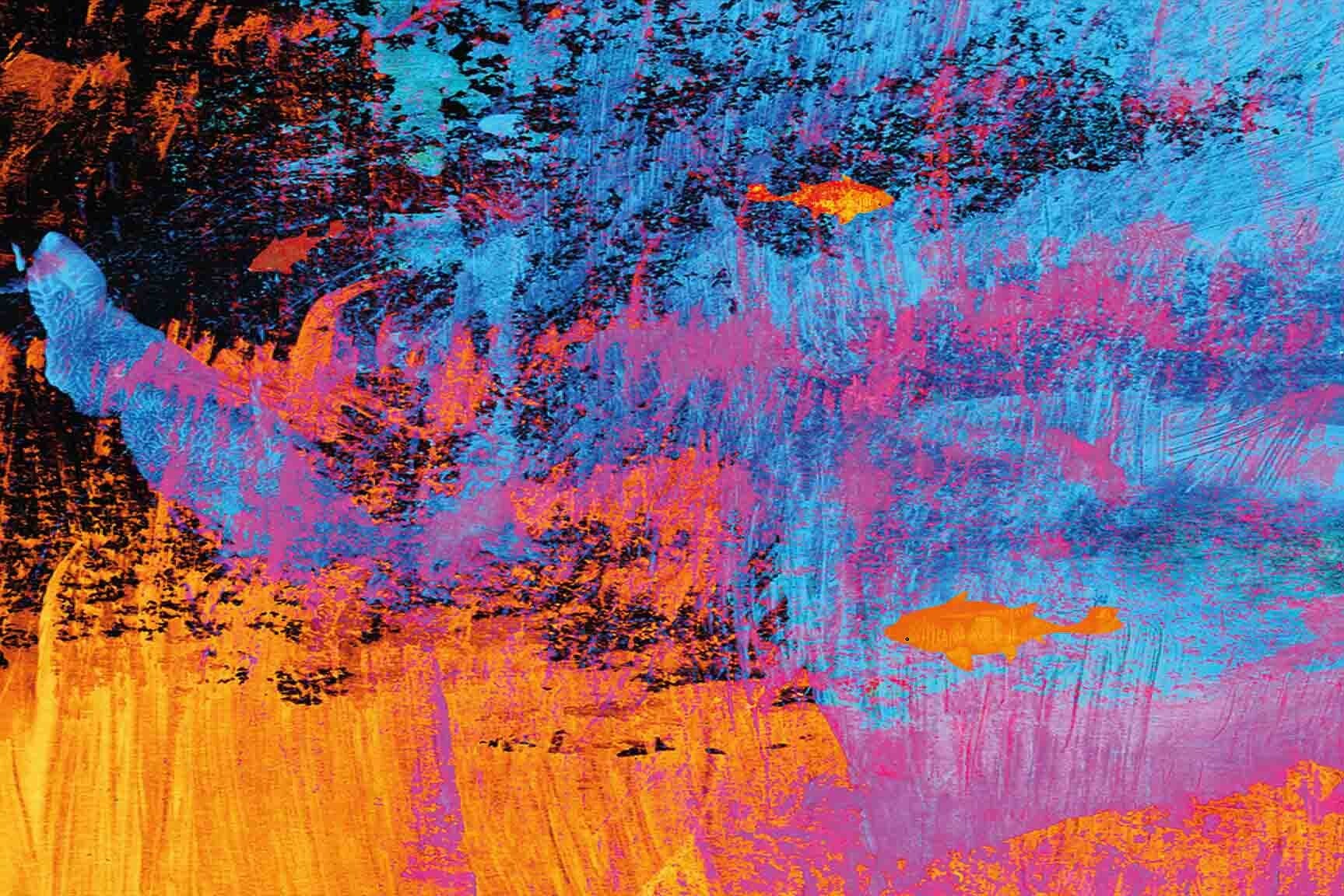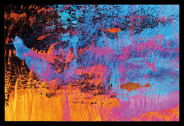 Deze kleurrijke prent is een combinatie van acrylverf, tekenwerk en het digitaal samenbrengen van diverse werken in lagen op de computer.