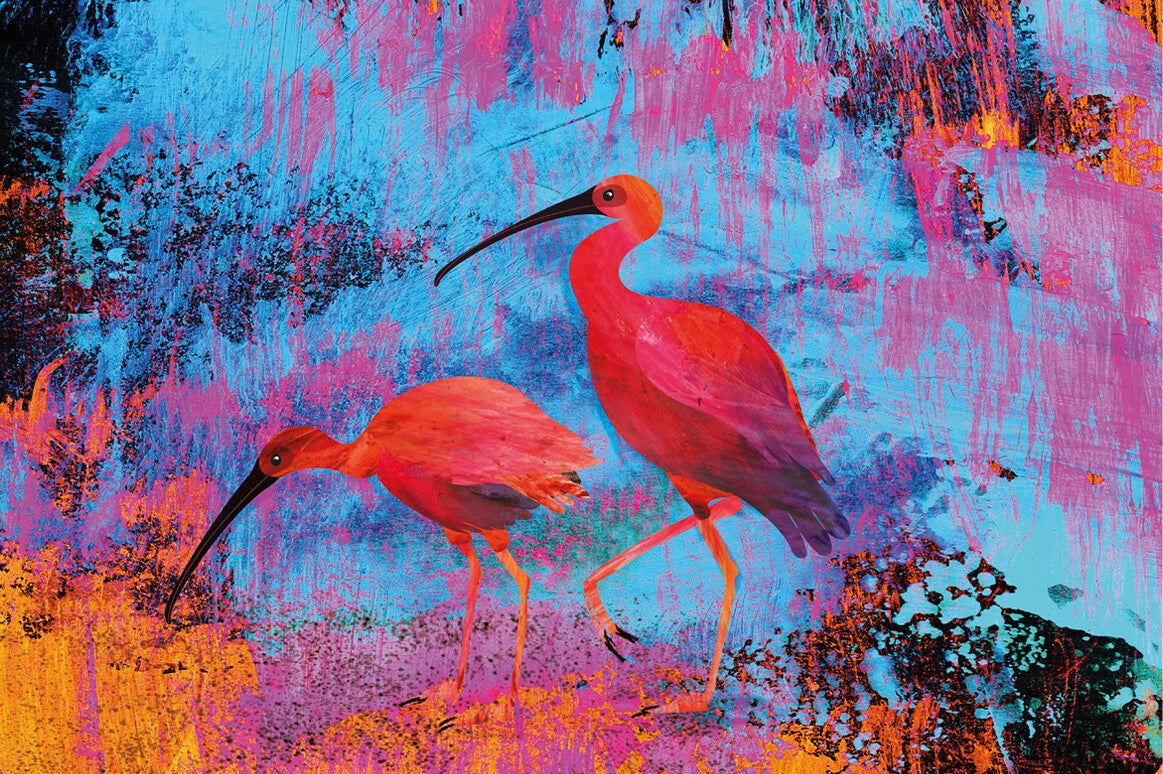 Deze kleurrijke prent is een combinatie van acrylverf, tekenwerk en het digitaal samenbrengen van diverse werken in lagen op de computer.