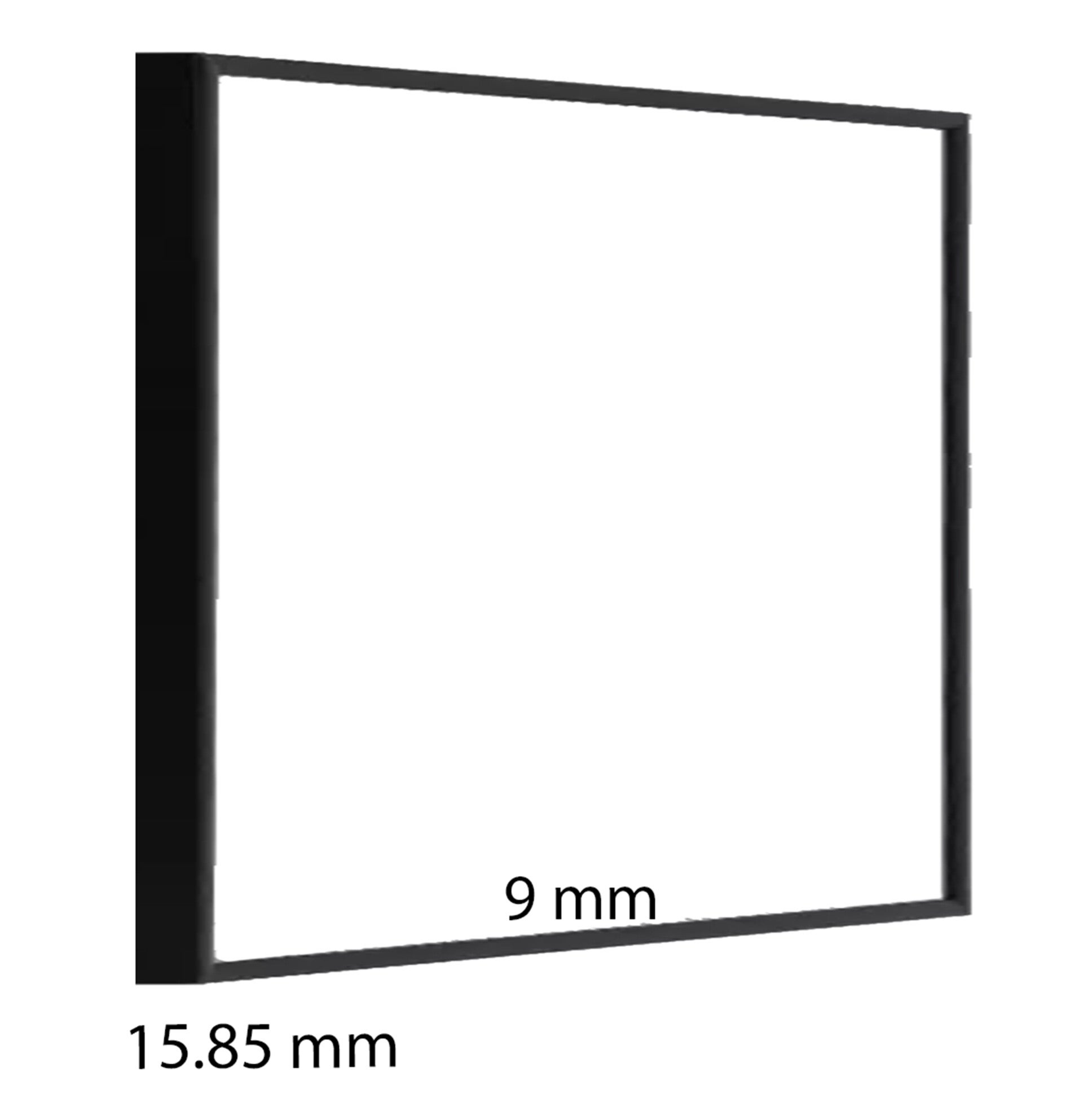 Ingelijst werk wordt geleverd in een zwarte aluminium lijst van 9 mm breed.